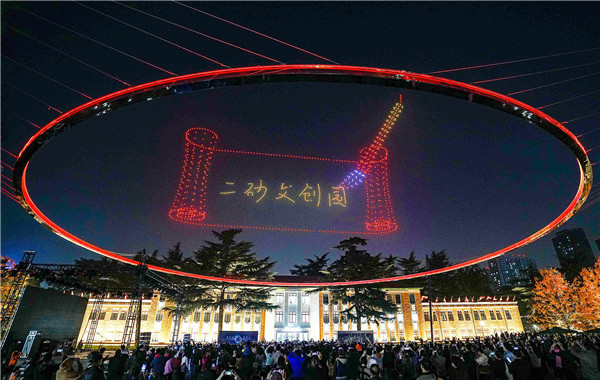 鄭州二砂文化創(chuàng)意園內(nèi)舉辦的無(wú)人機(jī)燈光秀 馬健 攝
