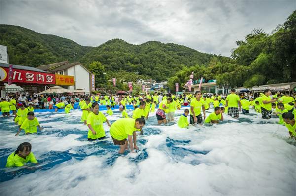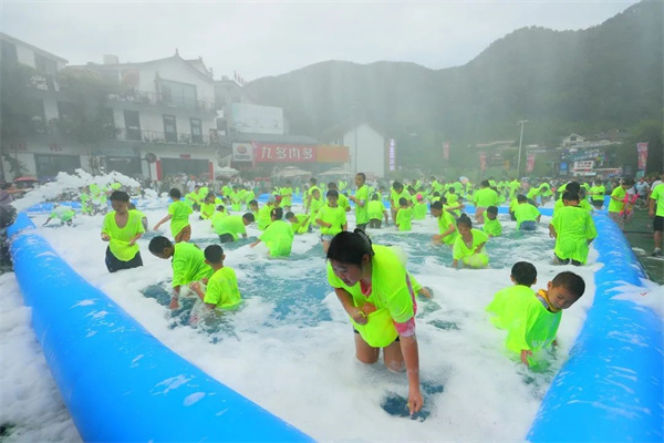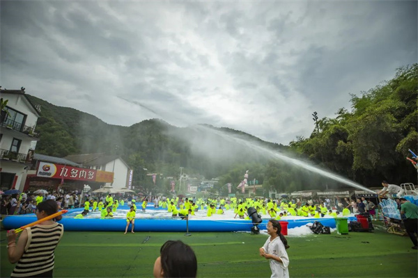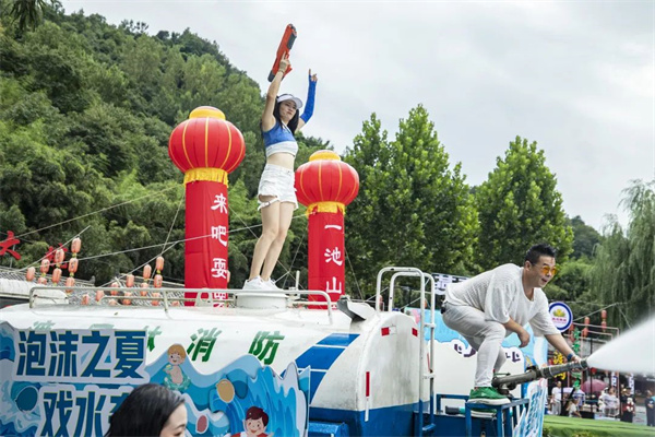 那就先來一場“濕身”儀式,高空灑水+勁爆電音,肆意搖擺,嗨翻全場。清爽的山泉水從天而降,迎面而來,現(xiàn)場游客尖叫連連,肆無忌憚地加入到這場“濕身”派對中。