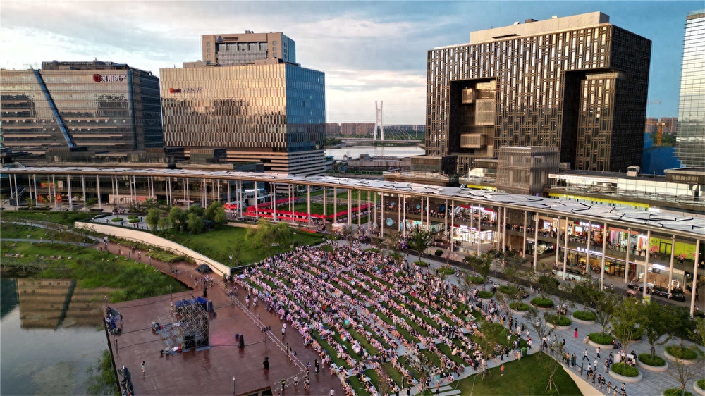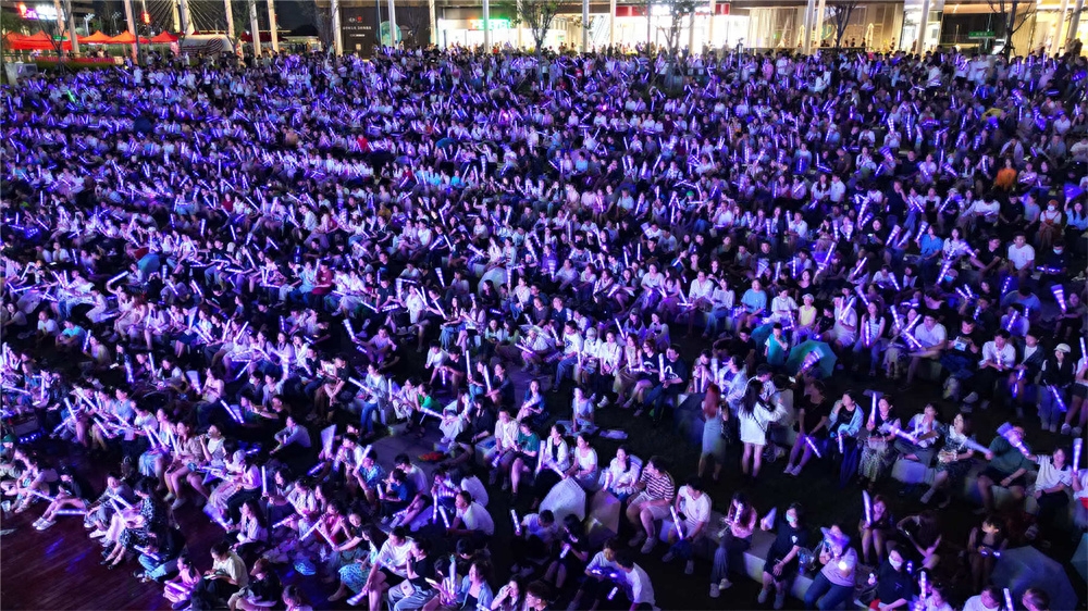 8月12日晚,鄭州市鄭東新區(qū)龍湖金融島銀泰露天劇場舉行了一場落日音樂會,全場大合唱經(jīng)典歌曲,揮舞的熒光棒匯成璀璨燈海,點燃城市激情。