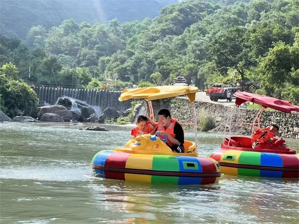 造型可愛的碰碰船穿行于湖面