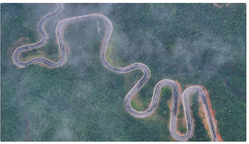 “車在林中行,人在畫中游。”在河南南陽老界嶺景區(qū),有一條生態(tài)大道、景觀大道、綠色大道!這條“最美云中公路”,全長5公里,綿延在海拔800-1100米的森林中,共48道彎。駕車在路上,一路映入眼簾的是望不到邊的綠色,郁郁蔥蔥,賞心悅目?罩懈╊,公路宛如鑲嵌在綠海中的一條飄帶,呈現(xiàn)出一幅美麗動人的生態(tài)畫卷。