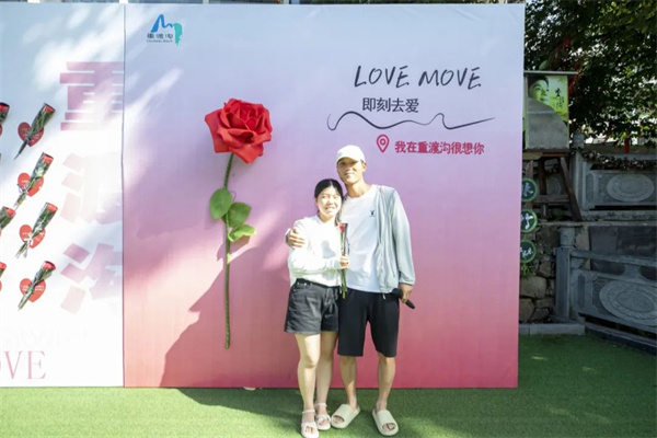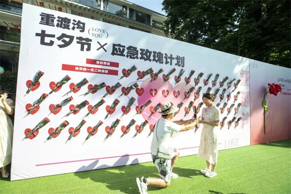 七夕節(jié)當(dāng)天,為給游客營(yíng)造浪漫的節(jié)日氛圍,豐富游客的旅行體驗(yàn),在重渡溝景區(qū)菩提樹廣場(chǎng)設(shè)立了應(yīng)急玫瑰墻,供游客表白使用,走近發(fā)現(xiàn),應(yīng)急玫瑰墻上不僅放著一朵朵嬌艷的玫瑰花,還印著浪漫的情話。不少游客駐足在應(yīng)急玫瑰墻前,大聲喊出自己的愛(ài)情宣言,摘下玫瑰花送給心愛(ài)的人。