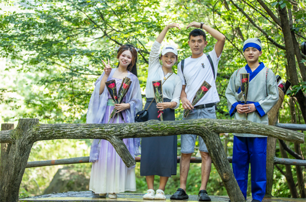 除此之外,“牛郎和織女”走在金雞河景區(qū)的山水間,為一路邂逅的情侶們送上象征愛(ài)情的玫瑰花和美好祝福。