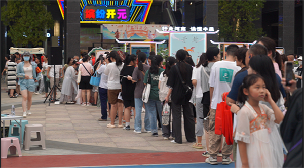 這枚印章濃縮了開封鐵塔、繁塔、清明上河園虹橋、州橋及附近汴河遺址海馬石壁、開封博物館、開封府、龍亭以及開封市花菊花等代表元素,使用套印手法和手工彩繪制作,色彩鮮艷、形象生動,帶走一幅印章畫,你就帶走了開封,帶走了開封的文化!帶走了美好的祝福!一經(jīng)推出,攤位前就排起長龍,大量游客慕名而來,只為現(xiàn)場親自動手體驗,分享至社交平臺;