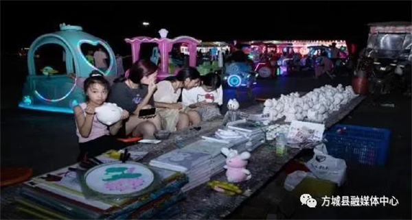 夕陽漸落,華燈初上,兩條霓虹燈帶宛如一串明珠依附在趙河兩側(cè),從棗莊大橋漫步至黨建廣場(chǎng),只見廣場(chǎng)內(nèi)燈光璀璨,人頭攢動(dòng),濃濃的“煙火氣”在此升騰,各樣的小攤早已擺滿了物件,有賣文創(chuàng)物品的、有賣炸雞零食的……