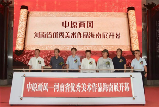 在眾人的見證下,夏斐、方啟雄、鄧子芳、陳茂葉、李明、阮江華等上臺,共同啟動“中原畫風(fēng)·河南省優(yōu)秀美術(shù)作品海南展”。