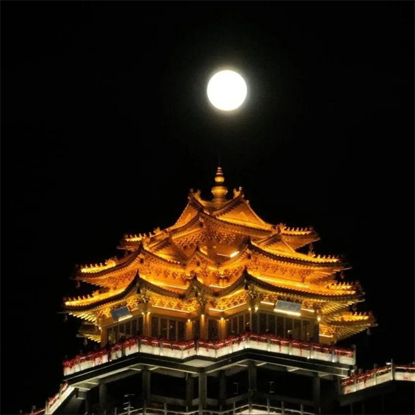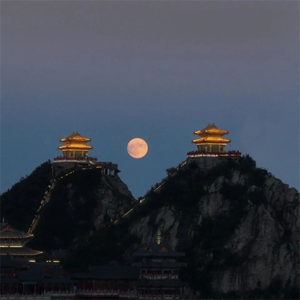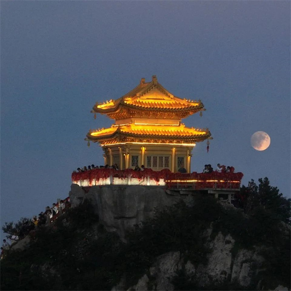 從舉頭望明月,到千里共嬋娟,月亮也被詩人寄以相思的名義寫進(jìn)詩詞。山頂?shù)囊股校盹L(fēng)微涼。金殿與月亮相遇、互相映襯,這是獨屬于老君山的極致浪漫。