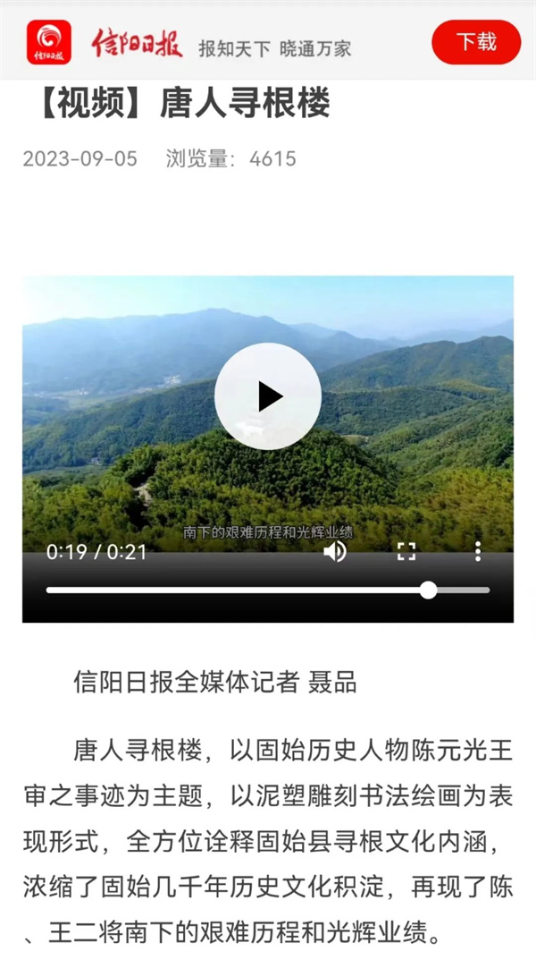 9月5日,信陽(yáng)日?qǐng)?bào)發(fā)布【視頻】唐人尋根樓,展現(xiàn)了固始西九華山景區(qū)根親旅游文化。