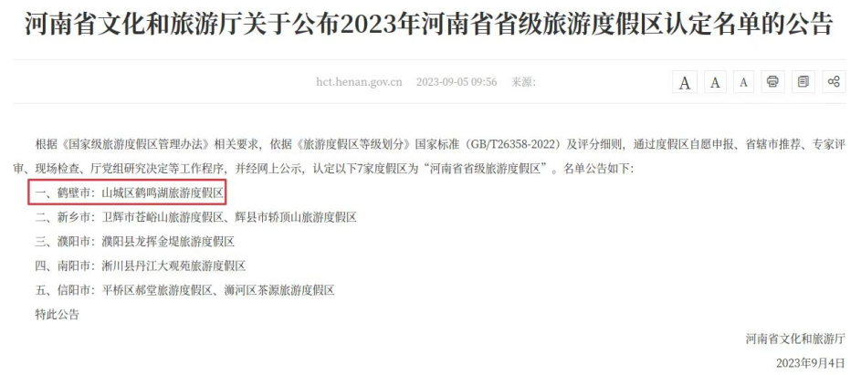9月5日,河南省文化和旅游廳發(fā)布《關(guān)于公布2023年河南省省級(jí)旅游度假區(qū)認(rèn)定名單的公告》,鶴壁市鶴鳴湖旅游度假區(qū)位列第一,榮膺省級(jí)旅游度假區(qū)。至此,鶴壁市省級(jí)旅游度假區(qū)數(shù)量已達(dá)到4家。