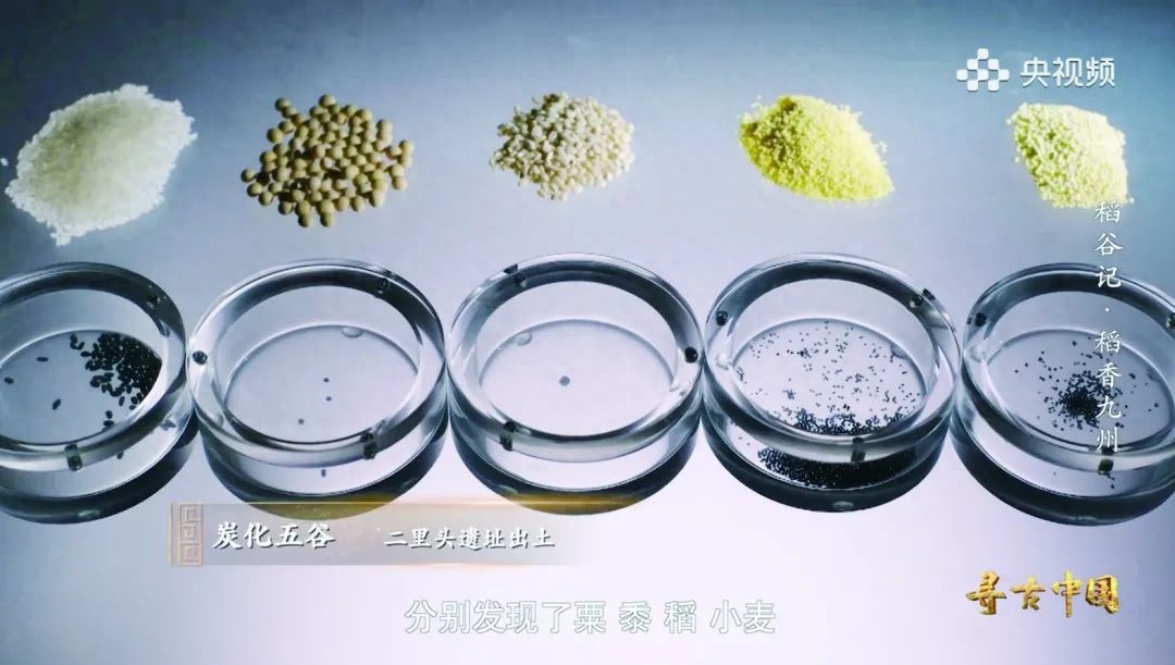 紀(jì)錄片中介紹,二里頭遺址是距今3800多年的夏朝中晚期都城,考古工作者在遺址的不同區(qū)域,分別發(fā)現(xiàn)了粟、黍、稻、小麥和大豆(合稱五谷)的炭化遺存。