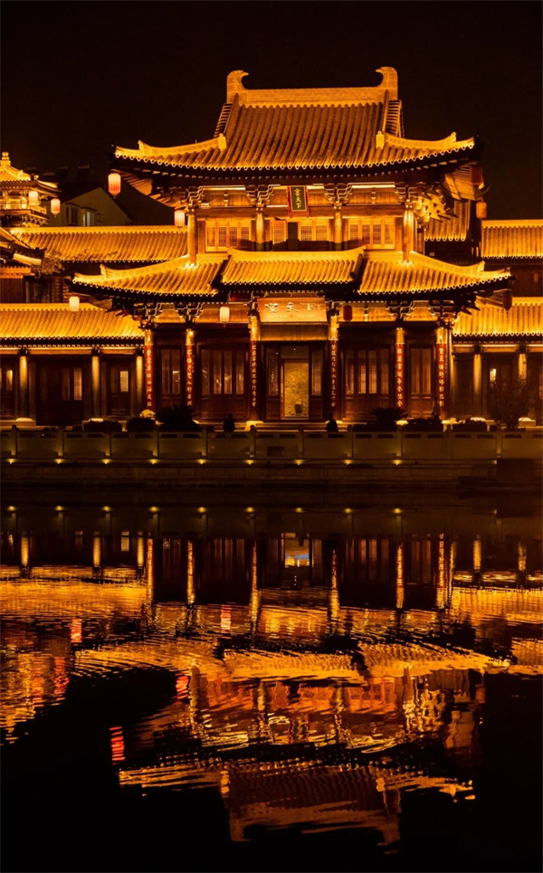 流水畫橋,燈籠朱盞,遠(yuǎn)望樓閣云天,重檐似山巒起伏。在這里拍一張漢服古韻大片,出片率99%。