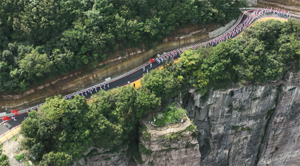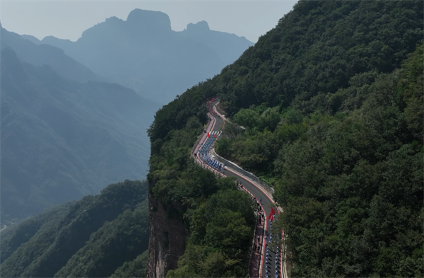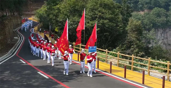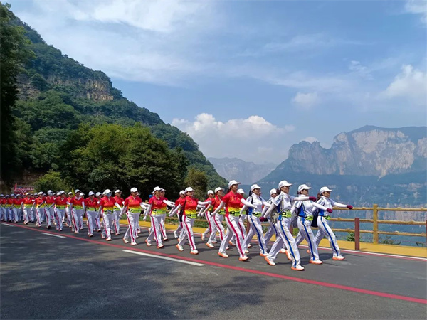 本次徒步大賽分為徒步競賽組(6公里)和大眾休閑健身組(3公里)。隨著一聲令響,來自全國各地的1000余名徒步愛好者,昂首挺胸、井然有序地向著目標(biāo)邁進(jìn)。各徒步隊伍著各色隊服,整齊劃一地穿行在壯美的天界山,他們在健康運動中切身感受太行山脈的奇險峻秀,在壯美山水中享受運動帶來的健康和快樂!