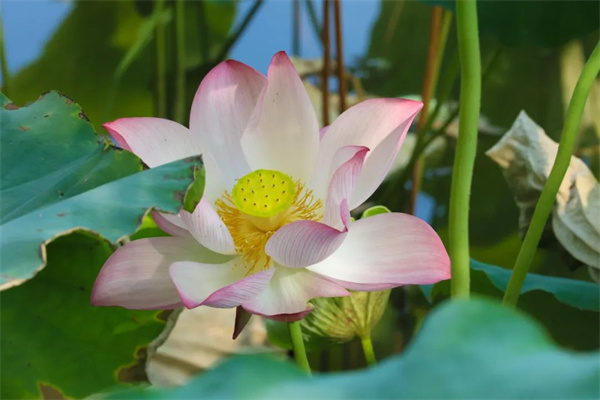 零星的荷花和隨風(fēng)搖曳的蘆葦,