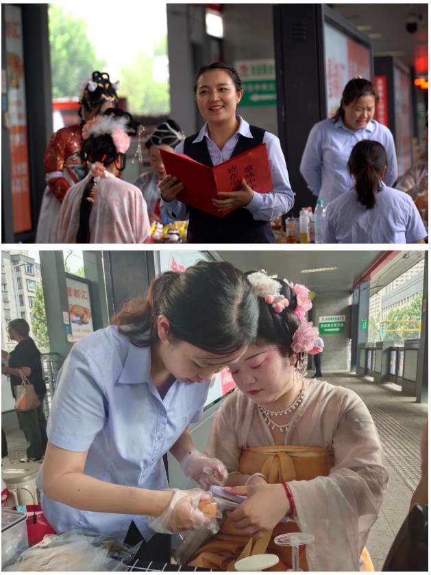 站臺(tái)還開展了豐富多彩的活動(dòng),讓市民共同參與,體驗(yàn)詩詞之美。站務(wù)長(zhǎng)石進(jìn)悅深情朗誦蘇軾的《水調(diào)歌頭·明月幾時(shí)有》吸引了很多市民駐足聆聽、一起背誦。周雯朗誦的《月光下的中國(guó)》飽含深情,讓大家感受到了拳拳的愛國(guó)熱情。市民還可以參加“讀詩詞 猜字謎”的環(huán)節(jié),答對(duì)可獲得小禮品一份。站臺(tái)里還有漢服小姐姐帶領(lǐng)大家做手工、做月餅,在體驗(yàn)手工制作樂趣的同時(shí)弘揚(yáng)中華民族傳統(tǒng)文化。