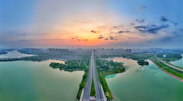 迎著朝霞,從空中俯瞰黑崗口調(diào)蓄水庫(kù),樹木郁郁蔥蔥,水面碧波蕩漾。這里景色優(yōu)美,是假日休閑放松的好去處。