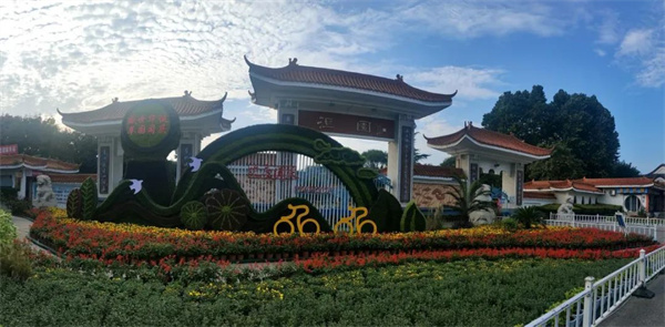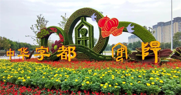 移步文峰大道和光明路東南角,長17米,高6.5米的“中華字都·安陽”主題花壇矗立在迎賓公園南廣場,花壇以兩個高大相切的圓環(huán)為主景,大圓環(huán)中間采用甲骨文“字”形做造型,凸顯甲骨文之鄉(xiāng)和中國文字的發(fā)源地特色。圓形自古就代表吉祥,寓意著圓滿、滿足,所以圓形深受中國人民的喜歡;兩個圓環(huán)如同兩個巨大的歷史車輪,承載著安陽三千年的厚重歷史底蘊滾滾向前,為安陽留下了無數(shù)印記的同時向著美好的憧憬飛奔而去。圓環(huán)下部搭配的牡丹、燈籠、白鴿等造型相組合,寓意著在黨的正確領導下,我們偉大的祖國山青水綠天更藍,人民生活步步高,我們揚起勝利的風帆向著中華民族偉大復興乘風破浪。
