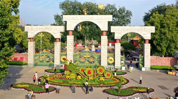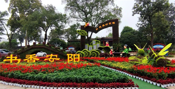 走近易園西門,一座長12米,高4.6米的立體花壇映入眼簾。該立體花壇以漢字文化為主題,旨在弘揚傳統(tǒng)文化,呈現(xiàn)漢字之美。其中畫軸上的宋朝韓琦《安陽好》,描繪出“安陽形勢魏西州”的美好畫面,反映了安陽歷朝歷代仁人志士對國泰民安、幸福安康的生活向往和對美好生活的歌頌。易園東門、南門還分別用鮮花擺放了甲骨文“安”字和現(xiàn)代文“易”字。