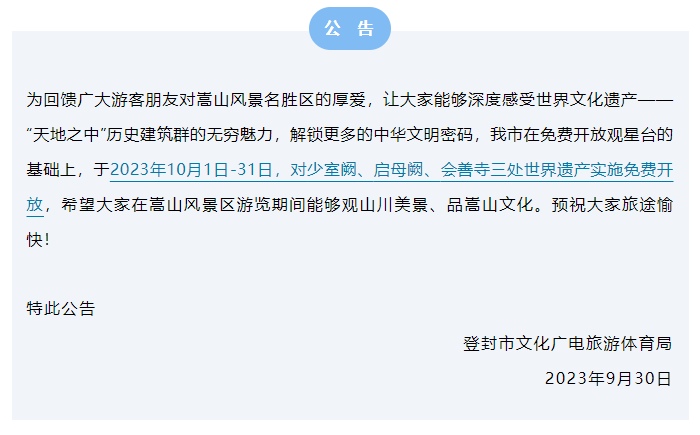 您的當(dāng)前位置:網(wǎng)站首頁 > 出行資訊 > >好消息!國慶假期中,登封這些景點免費開放!