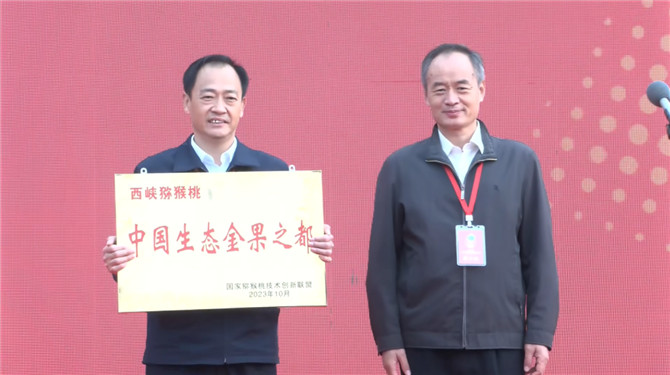 ▲國家獼猴桃科技創(chuàng)新聯(lián)盟(方金豹理事長)為西峽縣授牌“中國生態(tài)金果之都”,西峽縣委副書記、代縣長楊明雪受牌