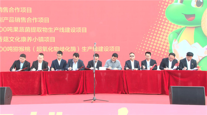 ▲①獼猴桃農(nóng)產(chǎn)品產(chǎn)購銷一體化項(xiàng)目,②郵政農(nóng)副產(chǎn)品銷售合作項(xiàng)目,③年產(chǎn)4000噸果蔬菌提取物生產(chǎn)線建設(shè)項(xiàng)目,④西峽縣香菇文化康養(yǎng)小鎮(zhèn)項(xiàng)目,⑤年產(chǎn)8000噸獼猴桃(超氧化物歧化酶)生產(chǎn)線建設(shè)項(xiàng)目5個(gè)項(xiàng)目雙方代表簽約