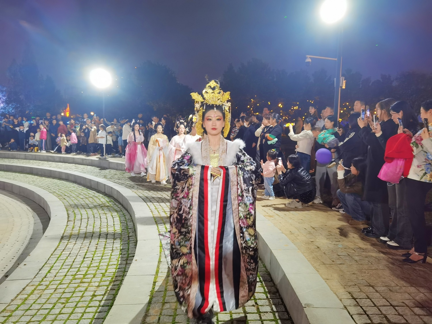 “我拍的這張最美!”一位小姑娘興奮地向同伴展示她拍攝的走秀瞬間。走秀期間,圍觀的市民紛紛拍照、錄視頻。還有的市民使用手機進行直播,與朋友分享這一精彩瞬間。市民周女士帶著女兒來到現(xiàn)場。當(dāng)晚,周女士的女兒特意換上她最喜歡的漢服小裙子,手拿可愛的氣球,到人群中感受不一樣的“熱鬧味兒”。