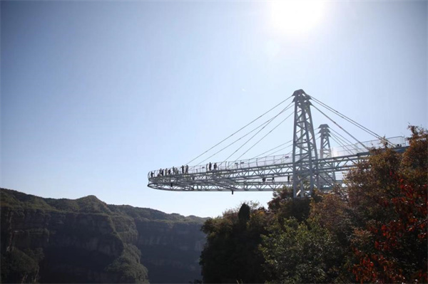 觀光車?吭趬(mèng)幻谷玻璃棧道,此處是一個(gè)圓形的“天空懸廊”,也是亞洲最高的玻璃棧道。記者們紛紛登上玻璃棧道觀景臺(tái),體驗(yàn)高空行走的驚險(xiǎn),俯瞰太行大峽谷全景。