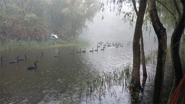 現(xiàn)在來(lái)到蒼龍湖,你可以看到藍(lán)天白云、朝霞日落、湖波水草下那一襲襲黑衣,一抹抹紅色安詳優(yōu)雅地結(jié)伴嬉戲,溫情脈脈地交頸摩挲,悠閑自得地梳理羽毛,倒映的典雅身姿與清澈蒼龍湖相映成趣,形成了人與自然和諧共生的美好畫面。
