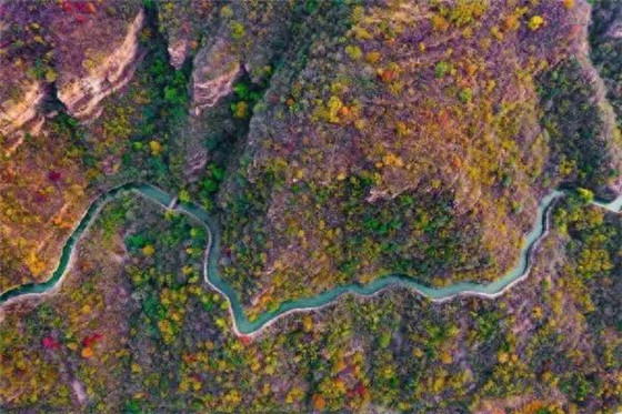 當(dāng)紅旗渠與秋天相遇,一條藍(lán)色飄帶穿過(guò)色彩斑斕的太行山。山與林的色彩碰撞,因?yàn)橛辛诉@環(huán)繞山勢(shì)的一條渠水,頃刻間有了靈魂。(秦陽(yáng)攝)