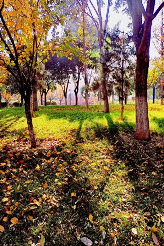 秋天的小樹(shù)林色彩斑斕,光影在草地上交錯(cuò)跳躍,仿佛是大自然的旋律在輕輕地奏響,宛如一幅美麗的油畫(huà)。(黃家群攝)