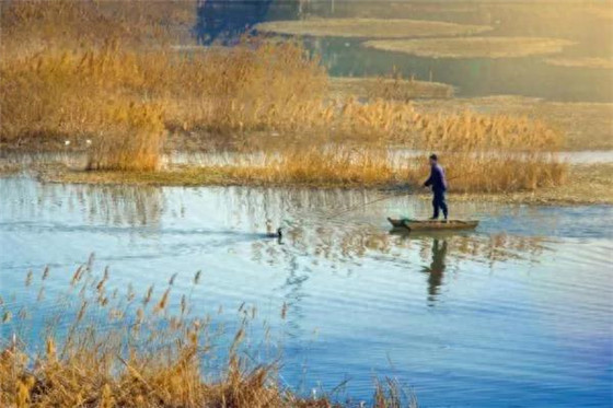 一葉扁舟,一支長(zhǎng)篙,幾只鸕鶿,金黃的蘆葦包圍著的一江秋水中,漁人沐浴著晨光,開(kāi)始了一天的忙碌。(付海順攝)