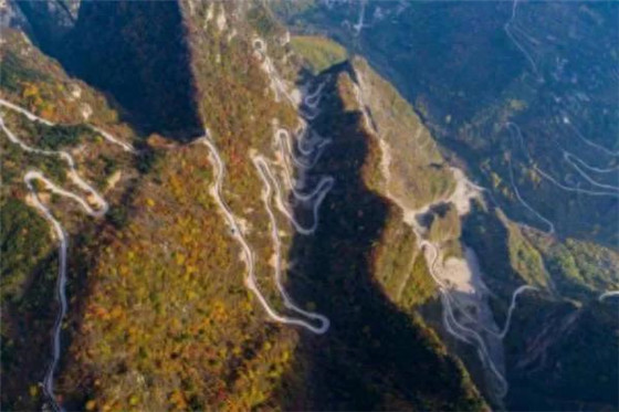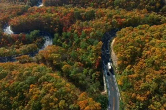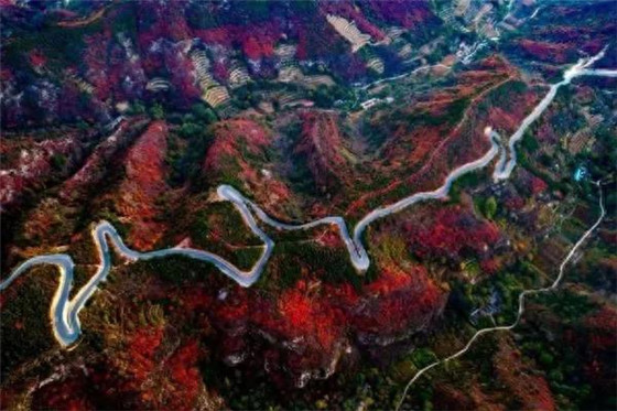 初秋時(shí)節(jié)的林石公路像一條彩帶,穿梭于楓葉流丹、層林盡染的太行山脈之間,車(chē)行其中仿佛置身于百里畫(huà)廊。(秦陽(yáng)攝)