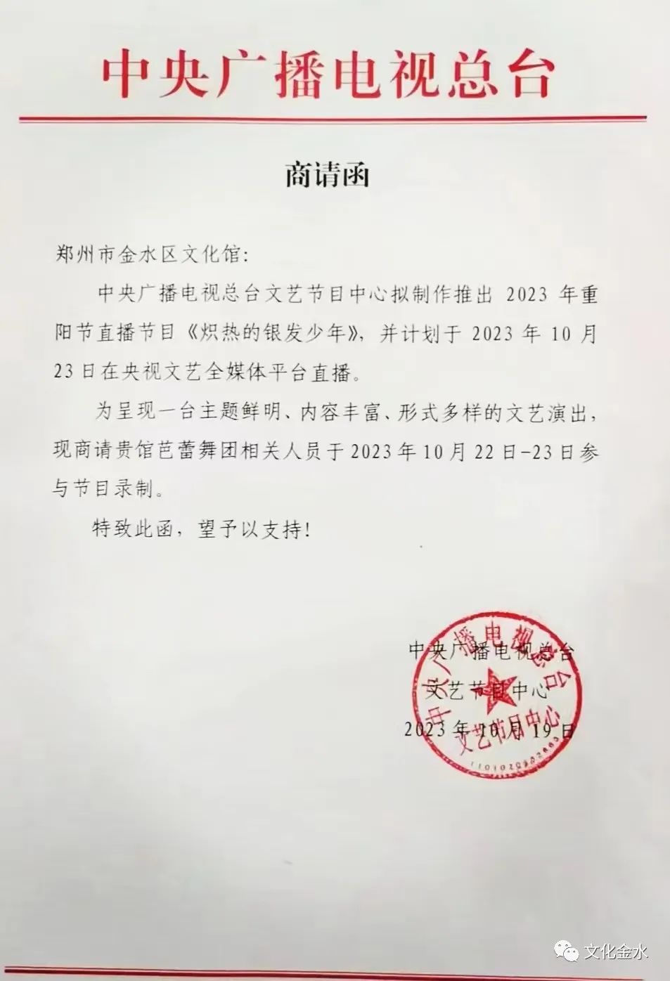 10月19日,金水區(qū)文化館收到了一封邀請(qǐng)函,原來,金水區(qū)文化館芭蕾舞團(tuán)被中央廣播電視總臺(tái)文藝節(jié)目組選中,受邀赴京參加《熾熱的銀發(fā)少年》排練及現(xiàn)場直播!