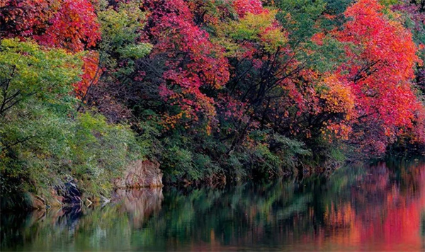 若是清晨,遇上朝陽甘露,紅葉更像是在紅綢上撒滿了顆顆的珍珠,亮晶晶光閃閃。在璀璨的陽光照耀下,把連綿起伏的群山裝扮得分外妖嬈,片片紅葉或鮮紅似火,或閃爍生輝,好像喝了醇厚而濃郁的美酒,姹紫嫣紅,層次分明,情趣盎然。