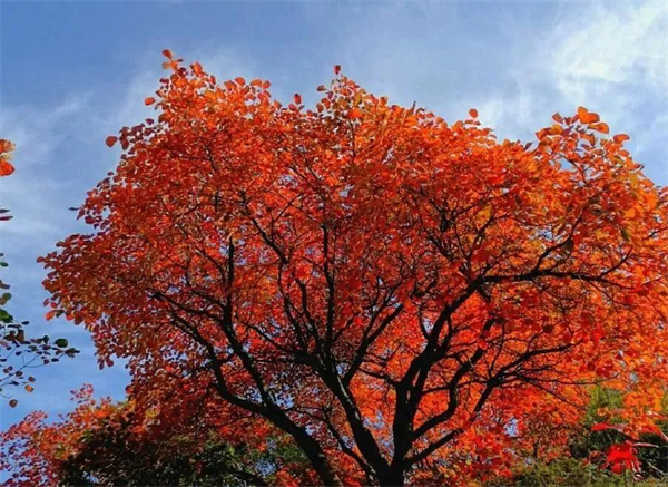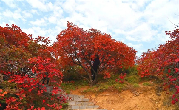 漫步山間石徑,兩邊樹枝搭連,又似紅色長廊,棵棵黃櫨如紅衣少女夾道迎賓。放眼望去,山坡上一簇簇,一片片,翠柏點綴其間,頗顯風(fēng)韻。