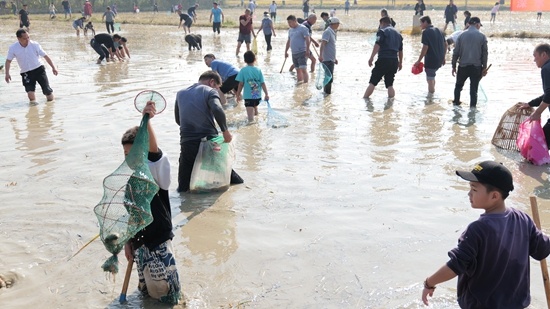 隨著活動(dòng)的重頭戲下田摸魚開始,現(xiàn)場(chǎng)的大人、小孩脫下鞋,卷起褲腳,拿起工具,紛紛涌向規(guī)定區(qū)域動(dòng)手捕魚捉魚,感受摸魚的樂(lè)趣,享受田園風(fēng)光和親子陪伴的樂(lè)趣。