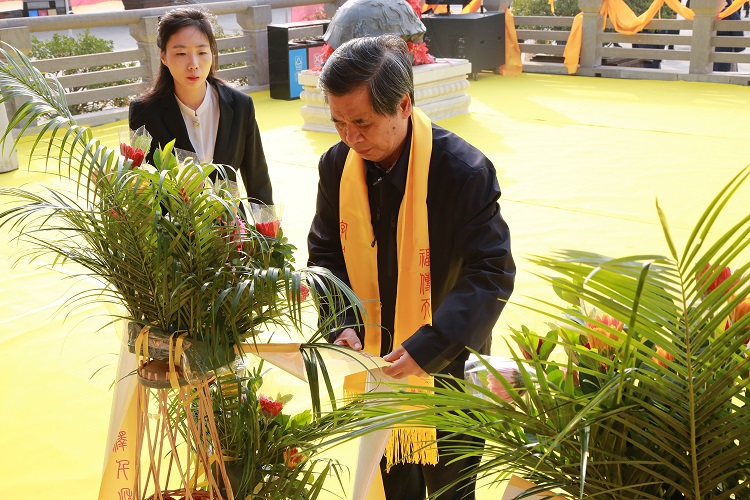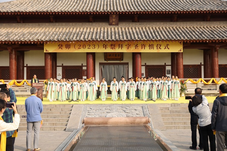 儀式上,與會(huì)領(lǐng)導(dǎo)和嘉賓向文宗字祖許慎敬獻(xiàn)了花籃,漯河市實(shí)驗(yàn)小學(xué)學(xué)生誦讀《說(shuō)文解字?jǐn)ⅰ,向字圣先師表達(dá)悼賢思哲、緬功追德的真摯敬意。隨后,王蘊(yùn)智恭讀祭文,頌揚(yáng)許慎的豐功偉績(jī)。最后,全體參祭人員面向字圣殿,向字圣許慎行鞠躬禮,以表達(dá)崇敬之情。