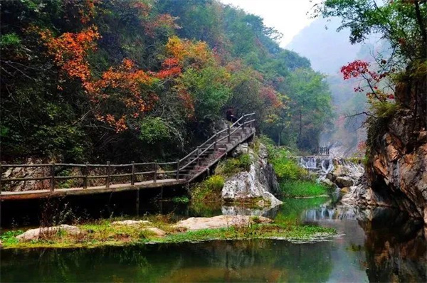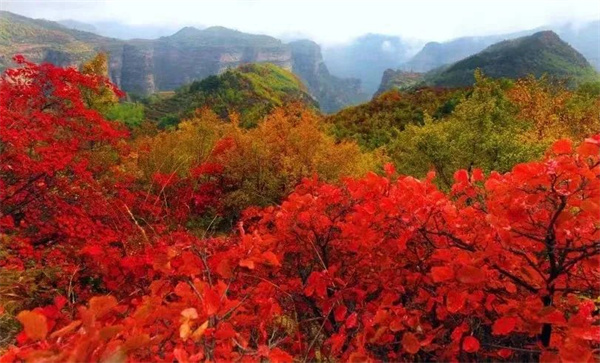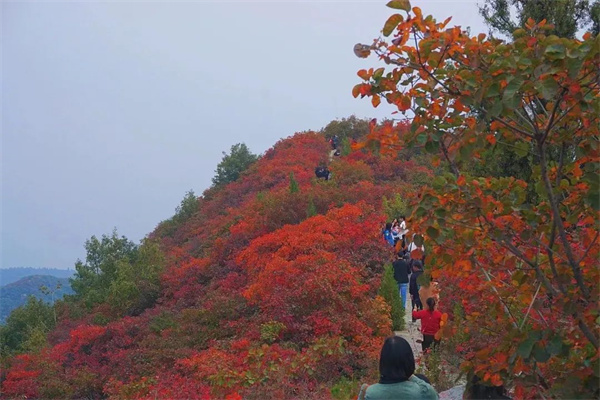 等到完全登頂?shù)哪且豢,氤氳的霧氣、連綿起伏的群山、萬山紅遍的壯麗景觀盡收眼底,古道蜿蜒在紅葉山水間,景色美不勝收,仿佛置身仙境,讓人沉思感嘆,不禁想到范仲淹的詩“碧云天,黃葉地,秋色連波,波上寒煙翠”里的模樣。