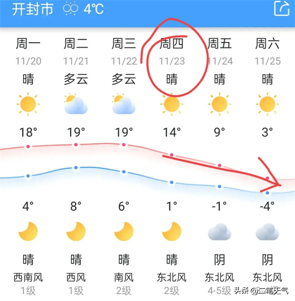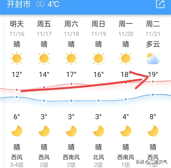以開封的溫度為例,從明天開始,會出現(xiàn)陸續(xù)的升溫,升溫幅度能夠達到7度,從12度升溫到19度!