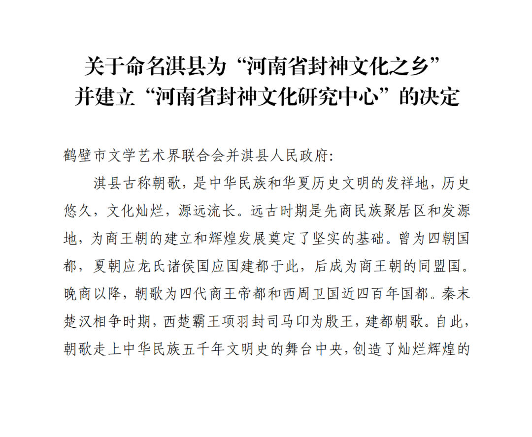 根據(jù)中共河南省委農(nóng)村工作領(lǐng)導(dǎo)小組豫農(nóng)領(lǐng)發(fā)〔2021〕7 號(hào)文件《關(guān)于印發(fā)〈河南省鄉(xiāng)村文化振興五年行動(dòng)計(jì)劃〉的通知》要求“傳承弘揚(yáng)地方優(yōu)秀民俗文化,開展‘中國(guó)民間文化之鄉(xiāng)’‘河南省民間文化藝術(shù)之鄉(xiāng)’創(chuàng)建活動(dòng)”的工作部署,經(jīng)河南省民間文化遺產(chǎn)搶救工程領(lǐng)導(dǎo)小組、河南省文聯(lián)和省民協(xié)組成省級(jí)專家組考察評(píng)審,決定命名淇縣為“河南省封神文化之鄉(xiāng)”并建立“河南省封神文化研究中心”。