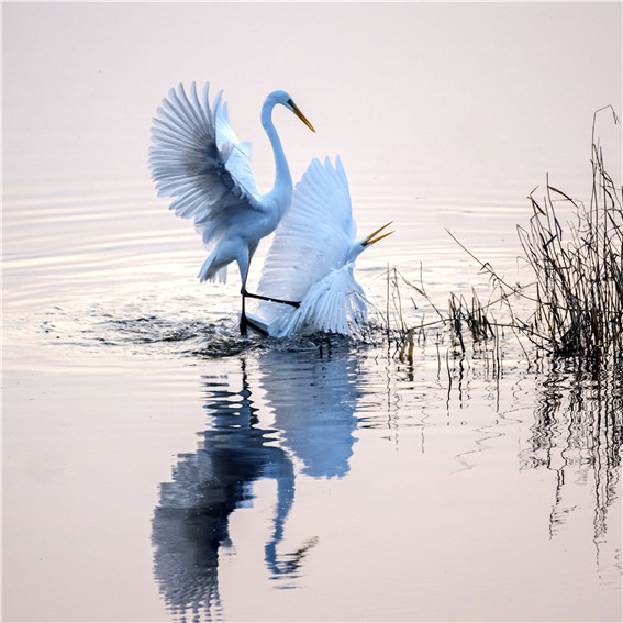 新鄉(xiāng)市鳳泉區(qū)鳳泉湖里的白鷺在嬉戲 鞏大安 攝