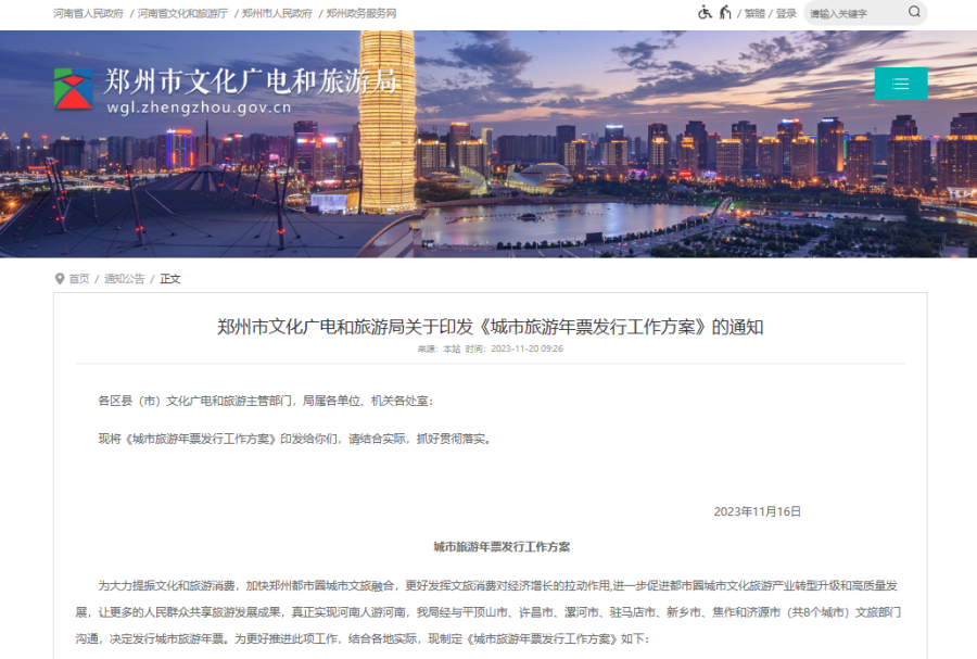 11月20日,鄭州市文化廣電和旅游局發(fā)布《城市旅游年票發(fā)行工作方案》通知。