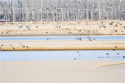 隨著生態(tài)環(huán)境向好,加上地方林業(yè)部門的全力呵護(hù),黃河濕地已成為適宜鳥類居住的“樂園”,吸引了小天鵝、銀鷗、綠頭鴨、赤麻鴨、斑嘴鴨等越冬鳥類光臨。它們時(shí)而在水面嬉戲、覓食,時(shí)而在水面上空飛舞盤旋,甚是熱鬧。
