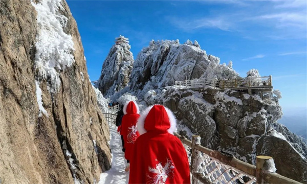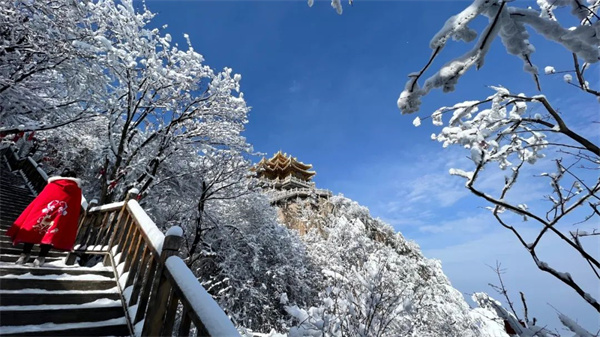 雪讓老君山美成了一首詩,幻化成了一片銀白色的童話世界,游客們也都成為了童話世界的主角…