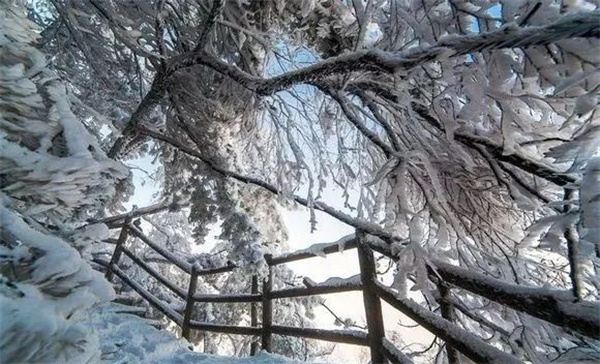 厚厚的云層籠罩在群山周圍,構成了白雪、霧凇、冰掛交相輝映的景象。