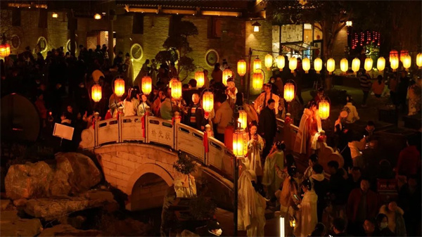 白天的古城青磚黛瓦,人文氣息濃厚,有衣袂輕揚(yáng)的漢服姑娘、有銀冠耀目的苗疆少年少女、還有英武豪邁的藏族男女……一步一景之間,盡顯洛城的繁華。