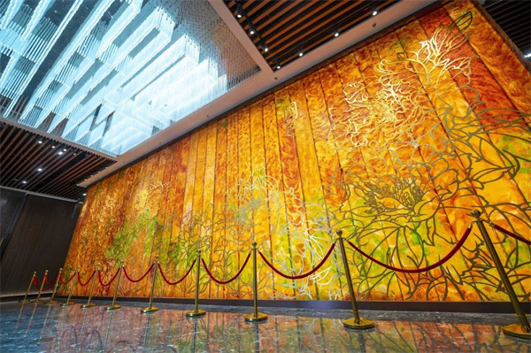在牡丹博物館內(nèi)色彩豐富的琉璃中,九朵造型各異的描金牡丹競(jìng)相開放。雍容華貴的牡丹與玲瓏剔透的琉璃交相呼應(yīng),牡丹博物館憑借著“高顏值”的建筑與藝術(shù)風(fēng)格吸粉無數(shù)。