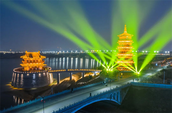 夜幕降臨時(shí),朱櫻塔燈光璀璨,盡顯洛陽(yáng)古都魅力。
