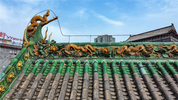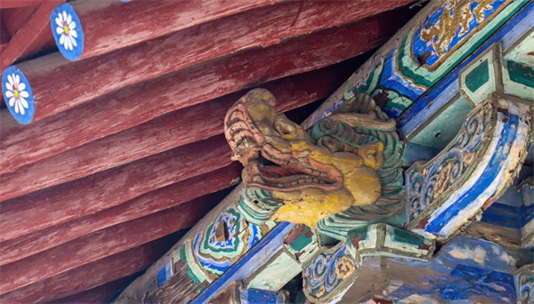 祖師廟占地面積約1700平方米,現(xiàn)存前殿、大殿和東耳房。其中,大殿坐北朝南,面闊5間,進(jìn)深3間,殿內(nèi)左右暖閣各1間,歇山頂,四周斗拱,飛檐起翹,琉璃瓦覆蓋,頂部正脊兩端有陶塑龍吻,脊背飾龍、荷花彩陶浮雕,殿頂四角戧背上塑四神。