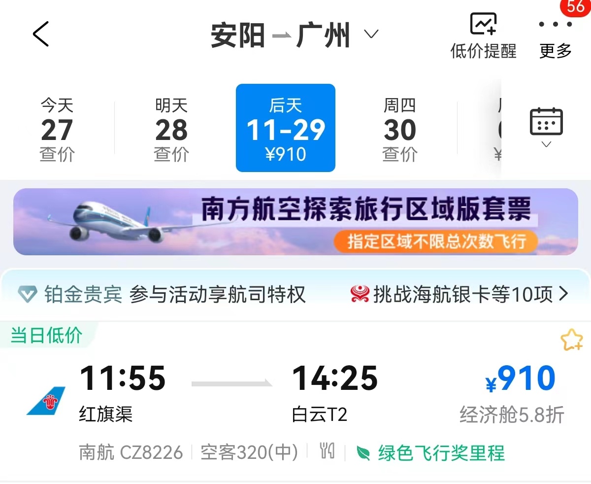 與此同時,安陽至廣州首條航線也將于當日同步通航。航線由中國南方航空公司執(zhí)飛,航班計劃每周4班(周一、三、五、日)。目前,該航線航班已開通線上預訂,旅客可以通過中國南方航空官網,獲取航班信息及辦理在線購票業(yè)務。記者在攜程、去哪兒旅行等平臺也看到,11月29日首飛航班尚有余位,票價為910元;而預訂12月1日之后的機票價格最低620元起,比安陽到廣州的高鐵二等座票價743.5元,還要節(jié)省100多元,時間方面也能節(jié)省近5小時。