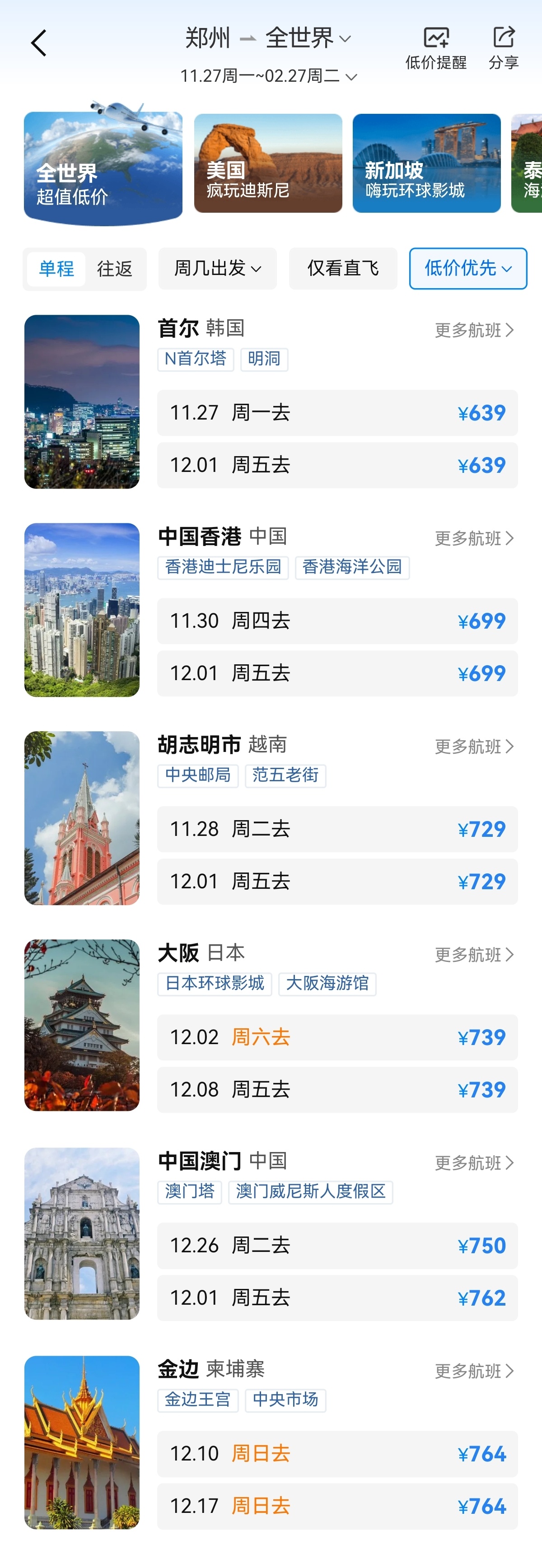 此外,除了國內機票的價格出現(xiàn)淡季“大跳水”,國際機票也出現(xiàn)了降幅。例如之前媒體報道的“寧波飛往韓國濟州島的機票跌到9元”,那么,從鄭州出發(fā)的國際機票情況如何呢?大河報·豫視頻記者從攜程App上看到,12月份,鄭州飛往韓國、日本、泰國、柬埔寨、越南、新加坡、馬來西亞、菲律賓等國家的國際機票價格基本在千元以下,12月1日,鄭州飛往韓國首爾的機票價格更是低至639元起。